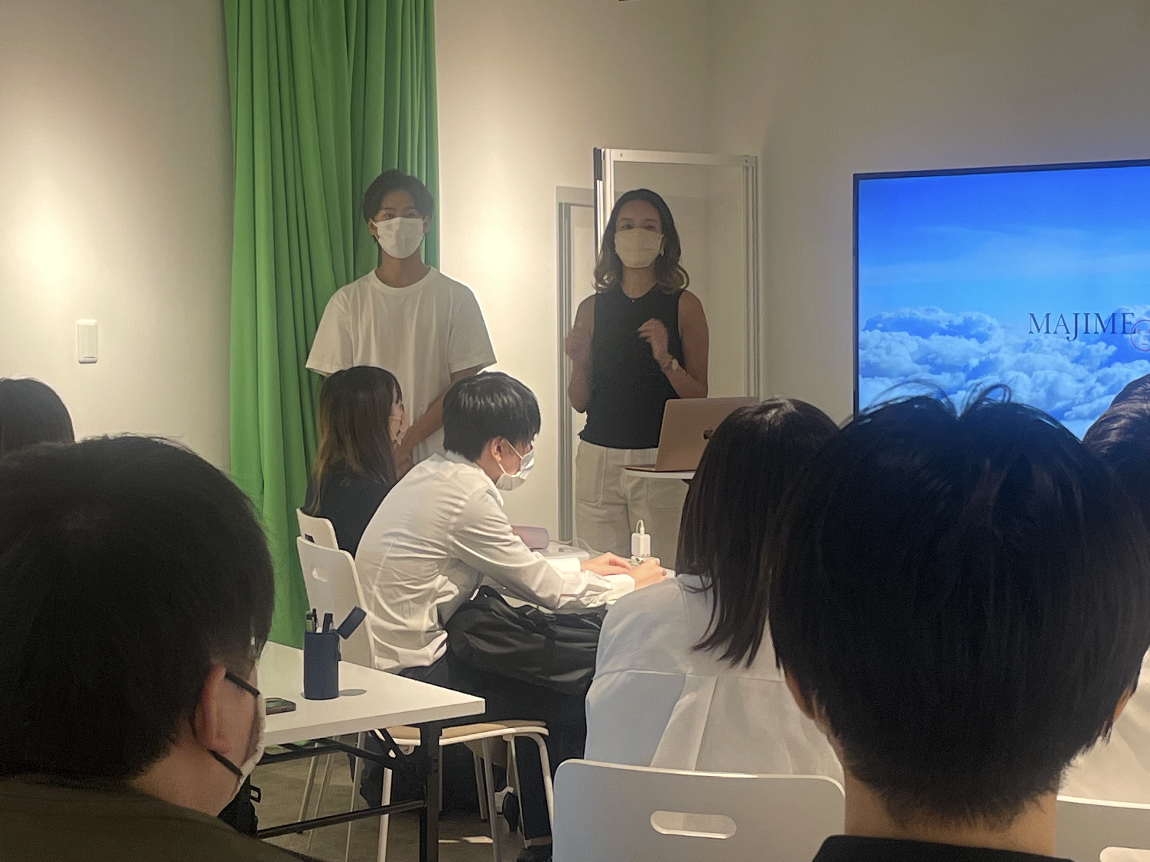 新型コロナウィルス感染拡大を防ぐため、これまでオンラインで実施してきましたが、今年は、「新しい働き方」を体得することを目的に、ハイブリッドで実施しました。学生たちは、「Aコース:企画+クリエイティブ(全10日間)」と「Bコース:企画プロデュース(全5日間)」のどちらかを選択。初日には、メンターであるMiraishipのオフィスにて、事前に受けた自己診断テストの結果の解説をもとにチームビルディングを行いました。2日目は、渋谷にある真面目社を全員で訪問し、人事担当の方から会社説明と今回のmissionをお聞きしました。午後からは、チームごとに、今回のミッションに合わせたSNS動画の企画に取り組みました。