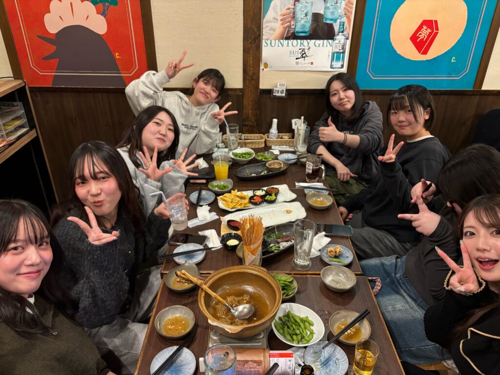 ゼミゴハンでは勝野先生とゼミ生で大学付近の美味しいお店に行きます。美味しいご飯とお酒が入るとゼミでは話せない内容も共有できてより仲が深まりました!