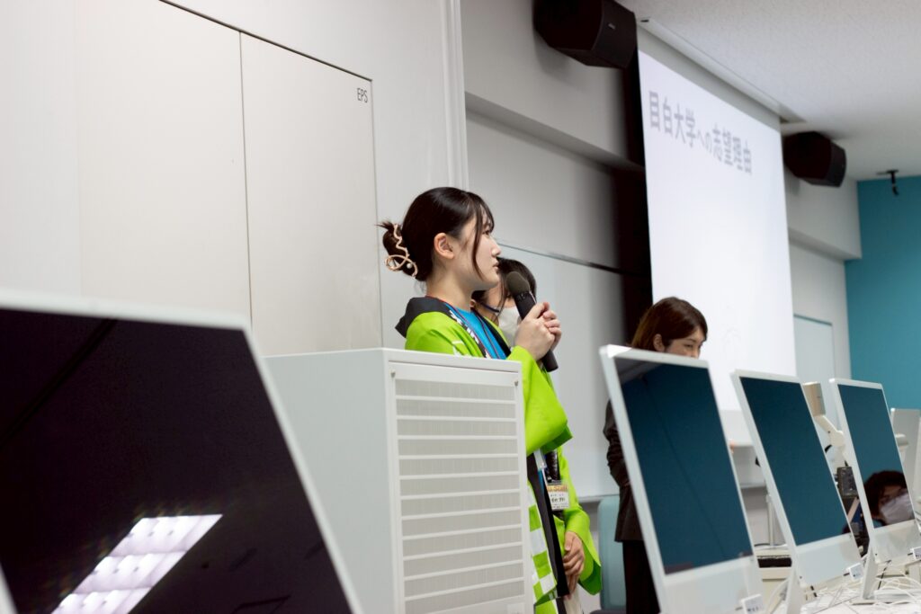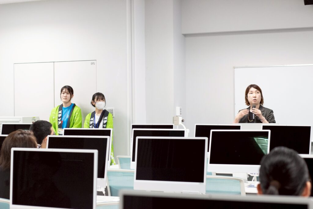 皆川武先生と牛山佳菜代先生による学科説明会では、授業内容や分野の選択、そして本学独自の社会連携プログラム「メディアクション」について紹介されました。
