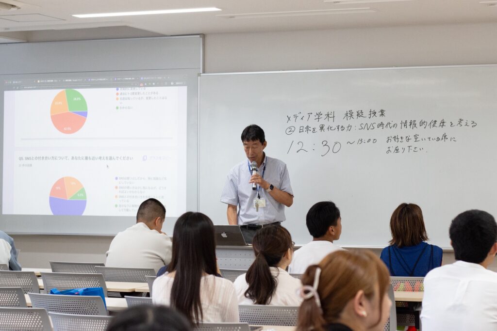 参加者はスマートフォンの利用時間を振り返るアンケートを通して、SNSとの関わり方を“客観的に”見直す機会を得ました。日々の情報接触について深く考える授業に、多くの参加者が興味を持った様子でした。