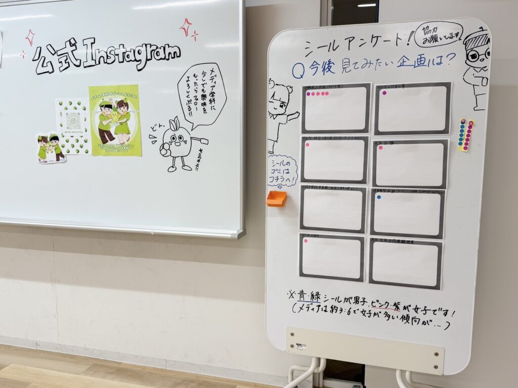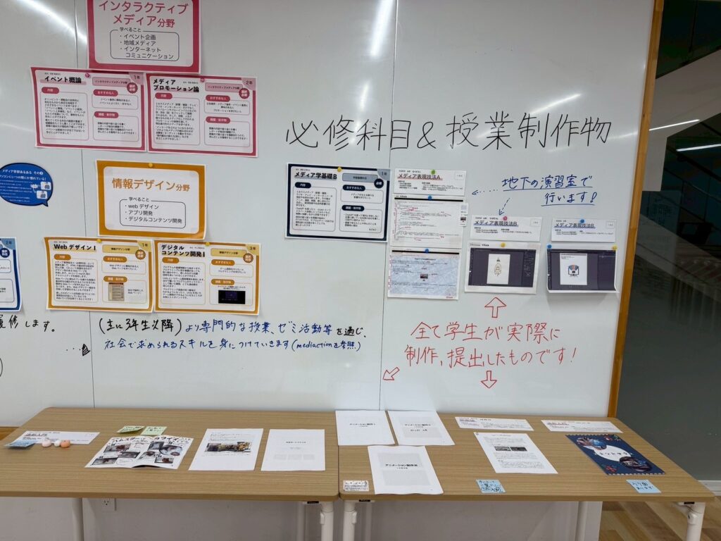 「メディア学科ではこんなこともやるんですね」と驚く高校生も多く、課題の内容や学びの広がりを具体的に伝えることができました。映像、デザイン、企画、分析――多様なメディア表現を通して、学科の魅力を“視覚的に”体験していただけた展示となりました。