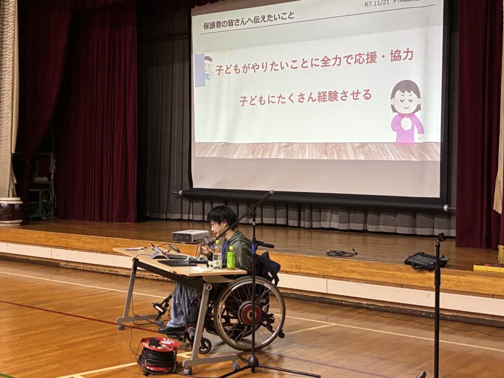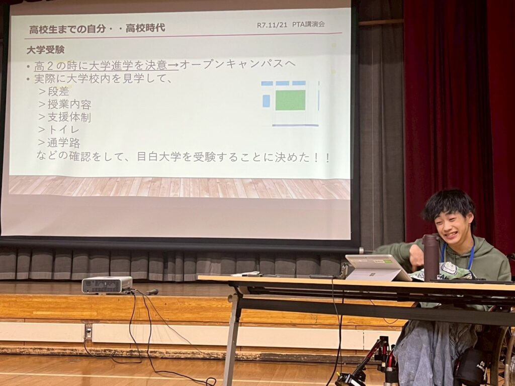 メディア学部メディア学科2年の小林幹太さんが、11月21日(金)に母校にて開催されたPTA主催の講演会に登壇し、ご自身のこれまでの経験や大学生活での挑戦についてお話ししました。