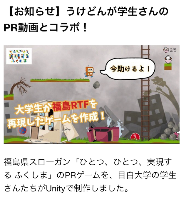 福島県スローガン「ひとつ、ひとつ、実現する ふくしま」のPRゲームを、目白大学の学生さんたちがUnityで制作しました。 南相馬市にある「福島ロボットテストフィールド」をテーマにしており、作中には「うけどん」や「ファミリー」が登場します。 ぜひ、ご覧ください。 制作:目白大学メディア学部メディア学科平山ゼミの皆さん平山ゼミは、継続的に福島県を応援する活動を行っています。福島県スローガン「ひとつ、ひとつ、実現する ふくしま」に、関心を寄せ続けて頂ければ幸いです。
