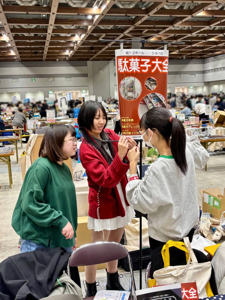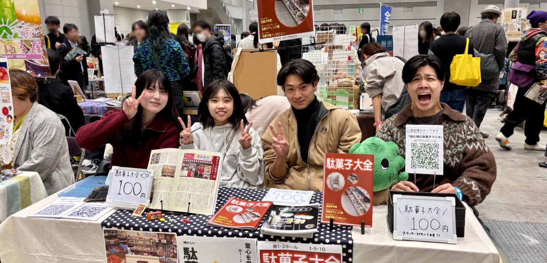 加藤賢ゼミ生は「童心を思い出そう」をテーマに、駄菓子の歴史や最先端の駄菓子屋、アレンジレシピといった複数の視点を盛り込んだZINE作品『駄菓子大全』を完成させました。テーマ設定や誌面構成においては学生同士で議論を重ね、チームワークを活かして幅広い取材や資料収集を行いました。当日は5時間で280部を完売するなど、多くの来場者の関心を集めました。学生たちはゼミ生全員がブースに立ち、来場者に対して自ら作品の意図や見どころを説明しながら販売を行い、対面で「つくり手として伝える」経験を積みました。