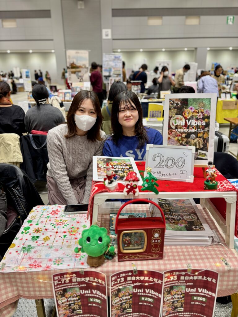 あわせて、三上義一ゼミの学生有志による自主制作冊子の販売も同日別ブースにて実施されました。三上ゼミ作品『Uni-Vibes』は、目白大学の大学生活をテーマに学生自身が取材を行い、構成・編集を行った冊子で、大学の日常を学生の視点から捉えた内容となっています。当日の運営や撤収作業においては、加藤ゼミ生と三上ゼミ生が協力する場面も見られ、ゼミを越えた連携によってイベント参加を円滑に進めることができました。