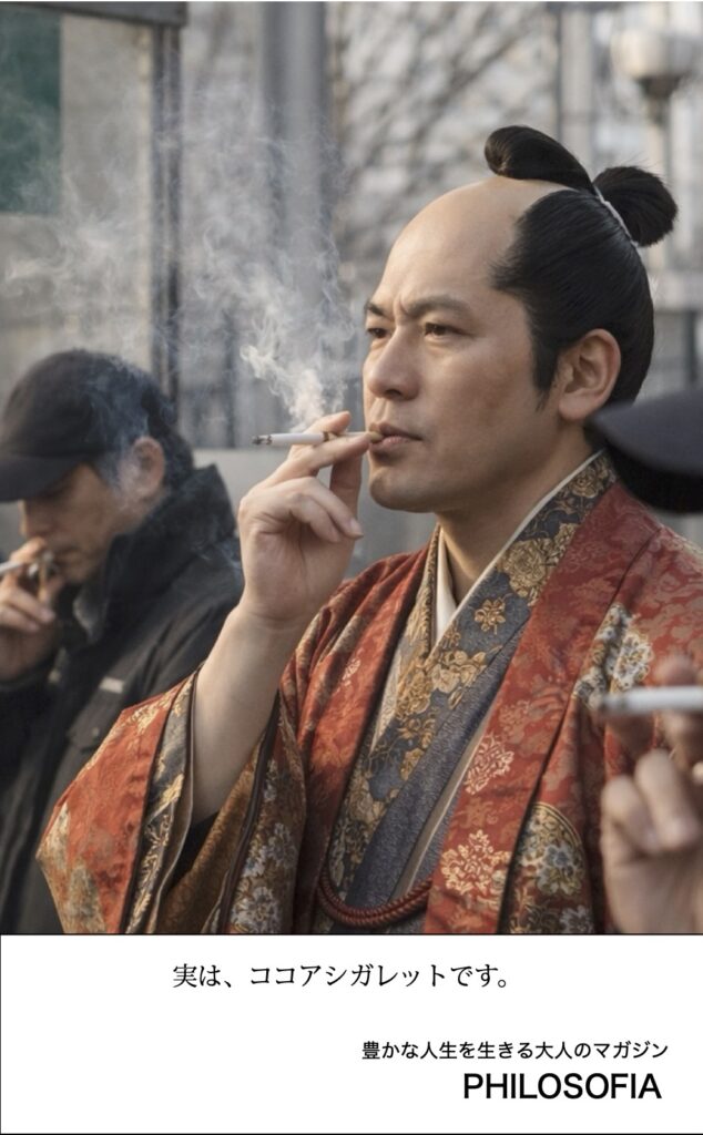 - TEAM E: 渋い表情でタバコのようなものをくわえる着物男性の写真に「実は、ココアシガレットです。」と付け、大人のマガジンの広告に 。